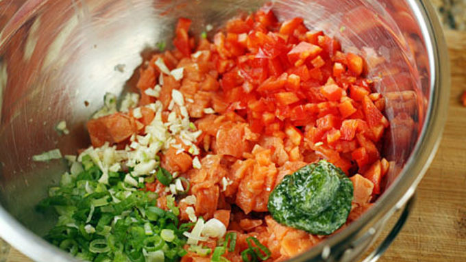 Step1Dice salmon fillet into small chunks. Add diced salmon to a bowl along with chopped scallions, red pepper, garlic, dill, egg, olive oil, lemon juice, coriander, cayenne, and a pinch of salt and pepper. Stir to combine.