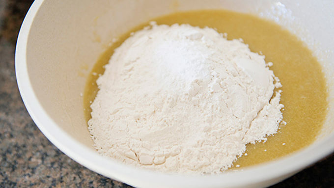 Step2Add flour, baking soda, and salt to the wet ingredients.