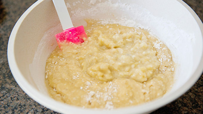 Step3Mash bananas with a fork and add to the batter. Mix until just combined.