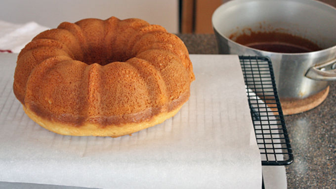 Step3Allow cake to cool 10 minutes in bundt pan before inverting onto a parchment paper-lined cooling rack to cool completely, about 1 hour.