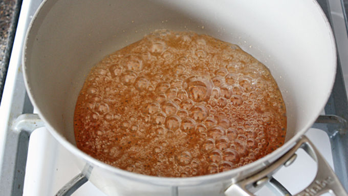 Step5Heat until bubbles form and the mixture is simmering. DO NOT STIR.