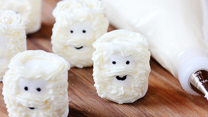 Step1Begin by using an edible marker to draw eyes and a mouth on each marshmallow.
