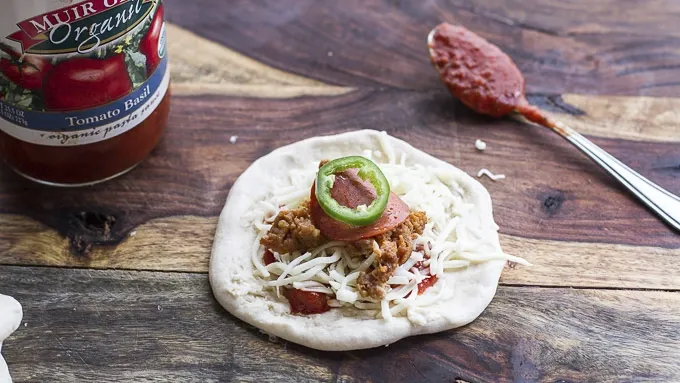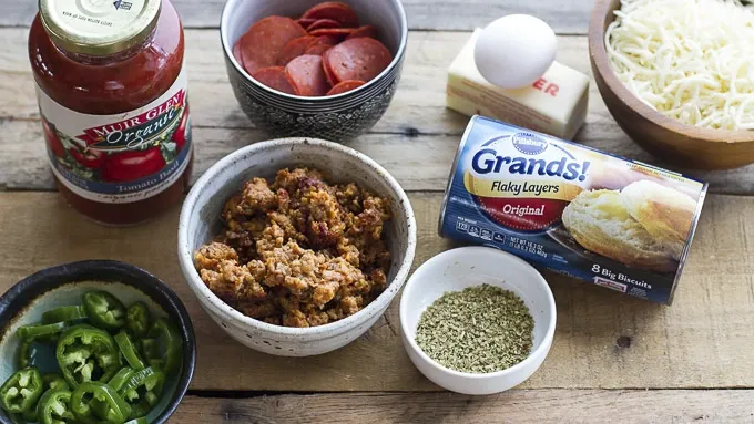 Evenly divide the mozzarella and provolone among each biscuit round, sprinkling the cheese right on top of the pasta sauce. Top the cheese with equal amounts of cooked sausage and then add a pepperoni to each biscuit. Top off with a jalapeno slice.