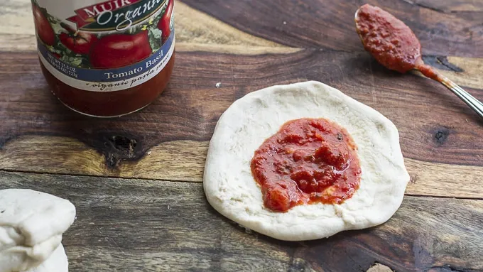 Pop open the can of biscuits. Working on a floured surface, and with one biscuit at a time, roll each biscuit out into a flattened disk. Spread each biscuit with a little pasta sauce, leaving a 1/2-inch border around the edges of the biscuit.