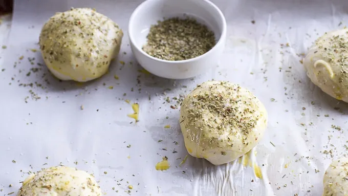 In a small bowl, combine the parmesan, garlic powder and oregano. Brush each pizza bomb with the beaten egg and then sprinkle with the parmesan-spice mixture. Finally, sprinkle each pizza bomb with kosher salt. Bake in the preheated oven for 20-25 minutes or until lightly golden on top.