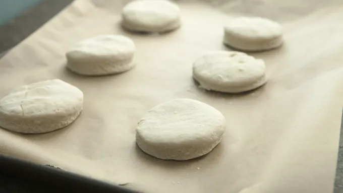 Step3Transfer biscuits to a baking sheet lined with parchment paper and bake for 9 to 10 minutes until the biscuits are puffed and browned. Remove the biscuits from the oven.