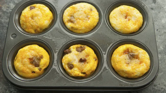 Step7Bake the muffin tins for 15 to 18 minutes at 350°F. The eggs should be set in the center and slightly pulling away from the sides of the muffin tins.