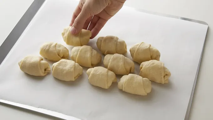 Step5Arrange the stuffed crescents in 4x4 rows, 1/4 inch apart on cookie sheet.
