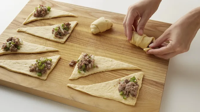 Step4Separate each can of dough into 8 triangles. On wide end of each triangle, spoon 1 generous tablespoonful of the sausage mixture. Roll up, starting at wide end, gently wrapping dough around sausage mixture and rolling to opposite point. Tuck ends underneath to enclose filling.