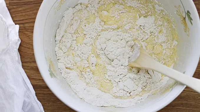Stir wet ingredients into dry ingredients with a wooden spoon or spatula.