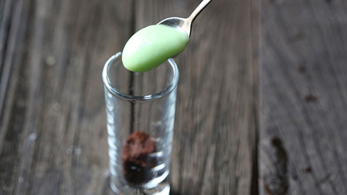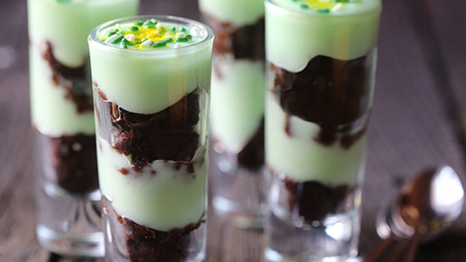 The perfect quick and easy dessert for St. Patty’s Day – crumbled brownies with minty pudding in mini shooter glasses!