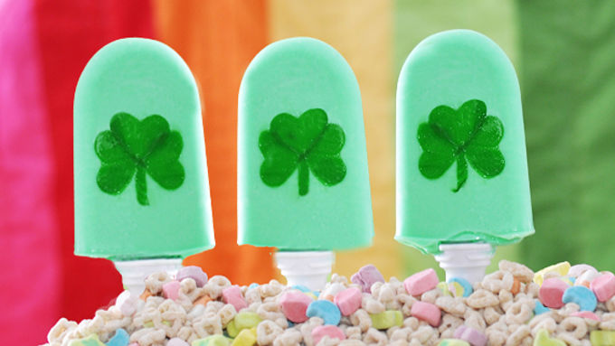 - Our Shamrock Freezer Pops are super festive – and the yogurt and milk in ‘em will make your inner leprechaun grin! Enjoy St. Patty’s Day without all those empty calories in sweet goodies or [gasp!] green beer. These Shamrock Freezer Pops are made from Yoplait Key Lime Yogurt and milk, so they pack some nom nutrition in with all that festive fun! We introduced you to this super special freezer pleaser last fall with our Halloween Freezer Pops. Now we’re baaaaack with a green pops version, all shamrocked up to knock the little elfin socks off your leprechauny holiday. You can do these in regular freezer pop molds and just freeze ‘em for a longer time if you want. But if you haven’t checked out a Zoku™ maker yet, do it! Serious coolness and quickness! Display them in the Zoku™ stand if you want. I put the stand on a plate piled with Lucky Charms cereal to hide the stand. Hehe … just about as clever as a sneaky little leprechaun, I’d say. If you’re feeling VERY magical, dip the ends of the pops in the remaining yogurt and some edible gold glitter. Oh yah – this is the stuff rainbows and pots of gold are really made of! Erin go bragh!