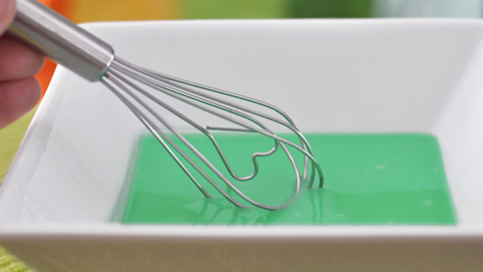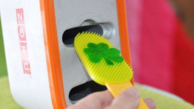 Step2Remove Zoku™ maker from freezer and place it up on end. (It must have been frozen for at least 24 hours.) Dip one shamrock in water and, using a paddle tool or a thin frosting spatula, press shamrock to inside of pops mold (making sure the shamrock faces the correct direction). Hold for a few seconds before releasing the paddle tool. Repeat with the remaining 2 shamrocks in the remaining 2 slots.