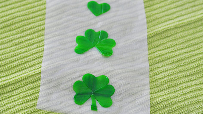 Step1Unroll one of the Fruit Roll-Ups™ snacks and, using only the green stripe, cut out 3 small heart shapes using a tiny cookie cutter. (Use a knife if you don't have a cookie cutter small enough.) Place the 3 hearts with points together to form a shamrock shape and press the edges to stick together. Add a small stem made from the leftover Fruit Roll-Ups™. Repeat with remaining Fruit Roll-Ups™ to make 2 more shamrocks.