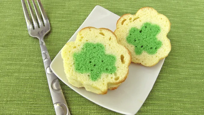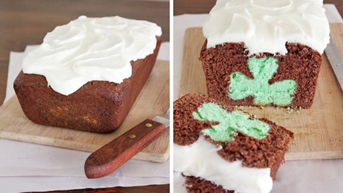 - Dude, there’s a shamrock in your pound cake. It ain’t no luck of the Irish – there is, in fact, a shamrock hiding inside this mint-chocolate flavored pound cake. And if you follow these directions below, you can make it happen. Oh yes. Firstly, make sure you have all the ingredients you need to make this cake. It’s a wee time consuming, so the last thing you want to encounter is a missing egg or a lack of milk. Also, some of the ingredients need to be at room temperature, so be sure to leave those out for a few hours ahead of time. Wow your friends and fellow St. Patrick’s Day revelers with this snazzy cake magic. It’s the next best thing to getting a pot of gold at the end of a rainbow. Mmm, cake!