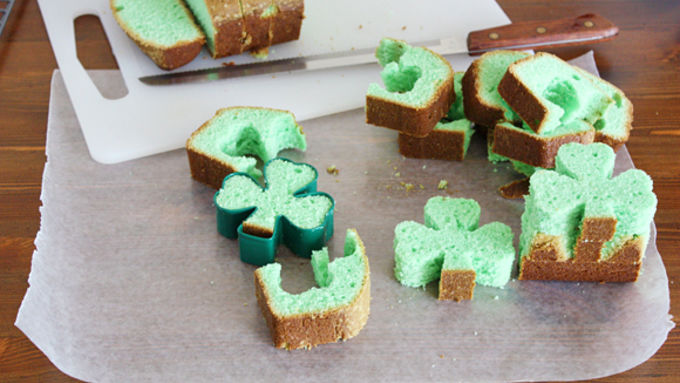 Step9Slice mint pound cake into 1-inch thick slices. Using a 3-inch wide shamrock cookie cutter, cut a shamrock shape out of each cake slice.