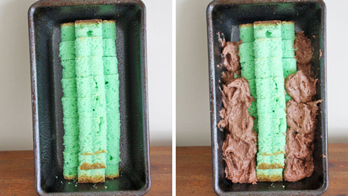 Step11Use a spoon to carefully place batter on either side of shamrock shapes to hold them in place. Carefully cover the rest of the shamrocks with batter; smooth top (you might not use all of the chocolate batter).