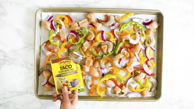 Step2Spread peppers, onion, shrimp and chicken over parchment in an even layer. Sprinkle with taco seasoning.