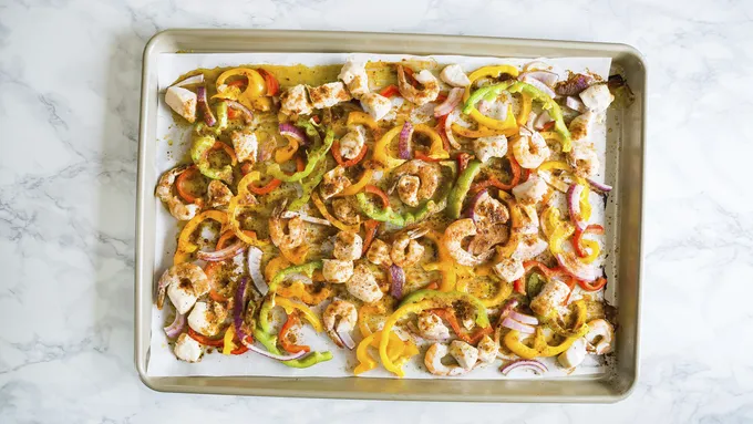 Take a shortcut to dinner tonight with sheet-pan fajitas. Peppers, onions, chicken and shrimp—all the good stuff, all on one pan. You can even prep this quick and simple meal in the morning, and bake when it’s dinnertime.