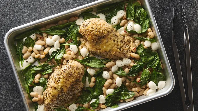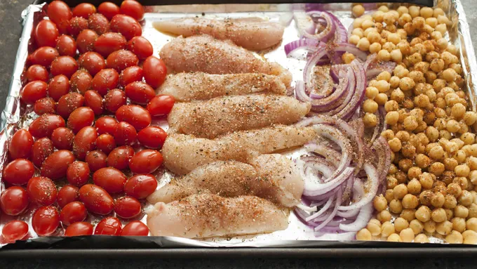 Step1Preheat oven to 400°F. On a baking sheet, lay out tomatoes, sliced red onion, chicken tenders, and drained and rinsed chickpeas. Drizzle with olive oil.
