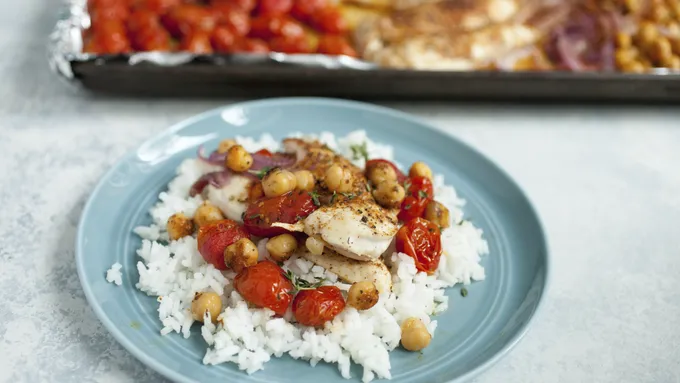 Step3Roast for 18 to 20 minutes, rotating once halfway through to ensure even cooking. When done, the chicken should be cooked through, the tomatoes should be bursting, and the chickpeas should be slightly crispy.