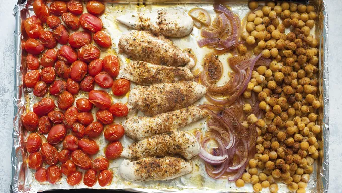 - One of the first pieces of kitchen equipment I always recommend for new cooks is a few good sheet pans. Many people think that I recommend these for cookies and stuff, but the truth is that you can cook whole meals on them! The beauty of this tomato, chicken and chick pea sheet pan dinner is everything cooks at once. Cleanup is super easy and the dish is SO delicious and healthy. There are only a few tricks to making this dish. The first is to make sure you drain and rinse the chickpeas. Don’t just pour them from the can onto the sheet pan because you don’t want all the liquid in the can. You want the chickpeas to have a chance to crisp up a bit in the oven. Other than that, keep the ingredients in fairly big chunks. Chicken strips or tenders work well (a pound should be about 6-8 tenders), keep the tomatoes whole, and slice the onions into big slices. Then it’s as simple as drizzling the sheet pan with a little oil, sprinkling on seasoning mix and popping the whole thing in the oven until the chicken is done (about 18-20 minutes). Enjoy!