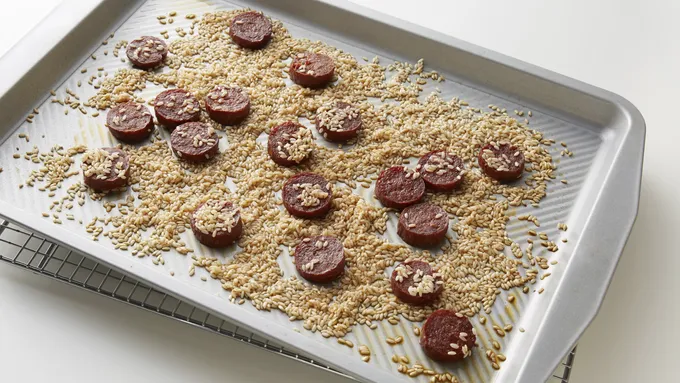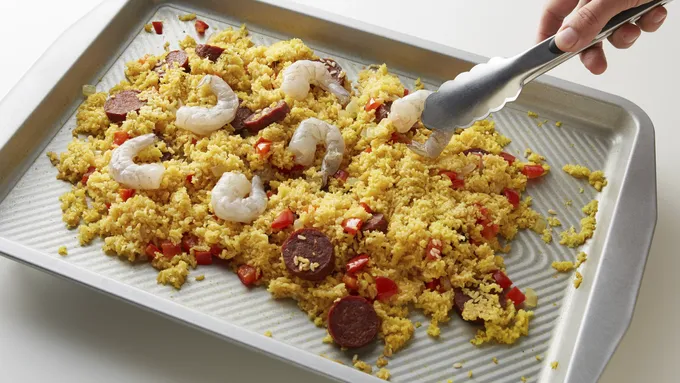 Place rice and chorizo on sheet pan. Drizzle with 1 tablespoon of the oil; stir to coat. Bake 8 minutes.
