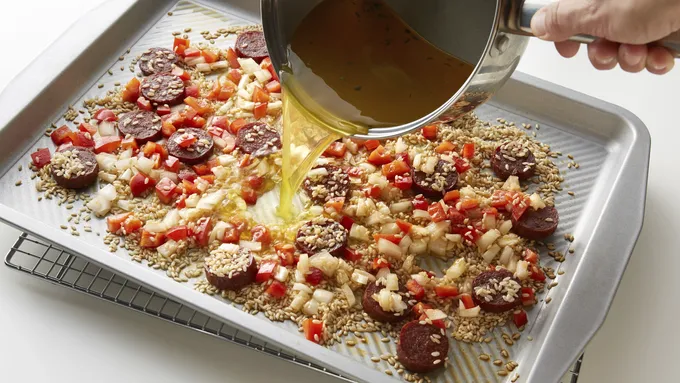 Remove sheet pan from oven. Add onions and bell pepper to saucepan; stir. Pour broth mixture over rice mixture. Carefully (the pan with be hot) cover sheet pan tightly with foil; bake 20 to 23 minutes or until rice is just tender.