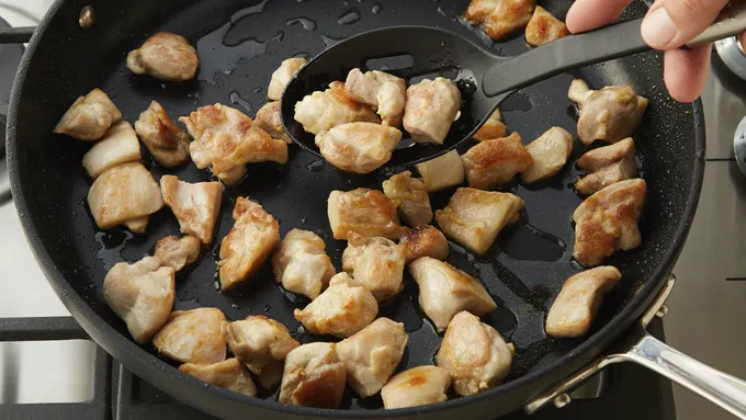 In 12-inch skillet, heat oil over medium-high heat. Add chicken; cook 5 to 7 minutes without moving, until browned on first side. Stir; cook 2 to 4 minutes longer, stirring frequently, until chicken is browned on all sides. Using slotted spoon, transfer to medium bowl; set aside.