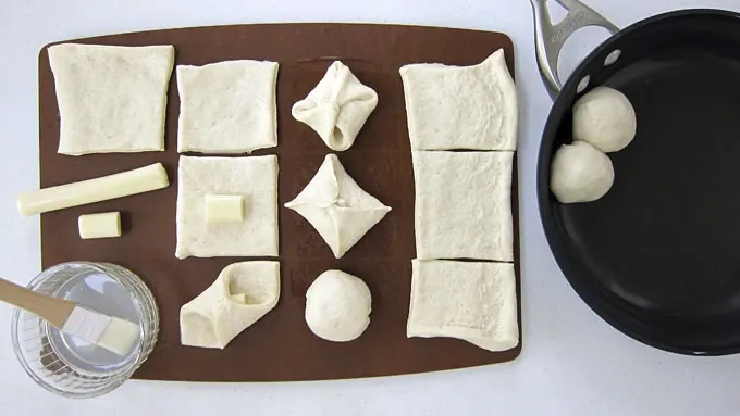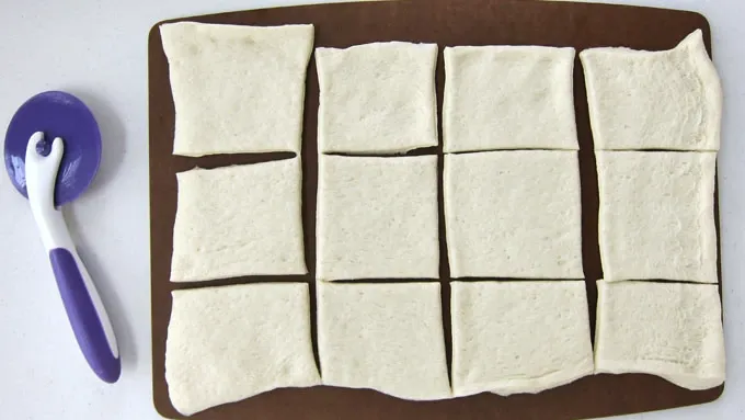 Cut each string cheese into 4 pieces. Unroll pizza dough and cut it into 12 squares.