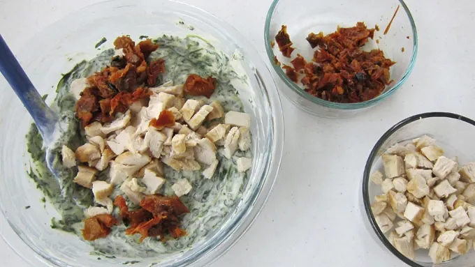 Sprinkle some of the remaining mozzarella cheese and all the remaining chicken and sun-dried tomatoes over the spinach dip, then top with the remaining mozzarella cheese.
