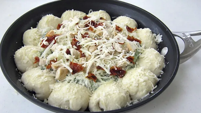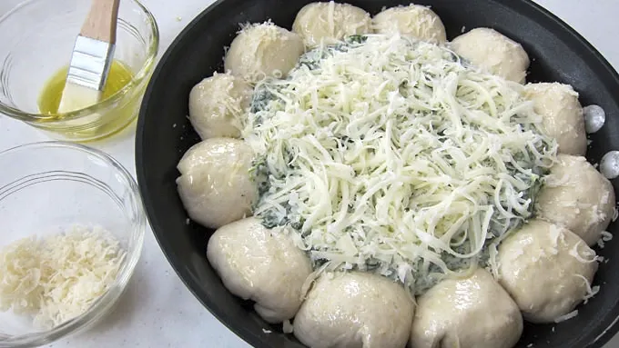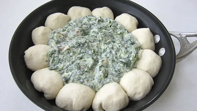 Arrange the balls of dough in a single ring around the edge of the buttered skillet. Spoon spinach mixture into the center of the skillet.