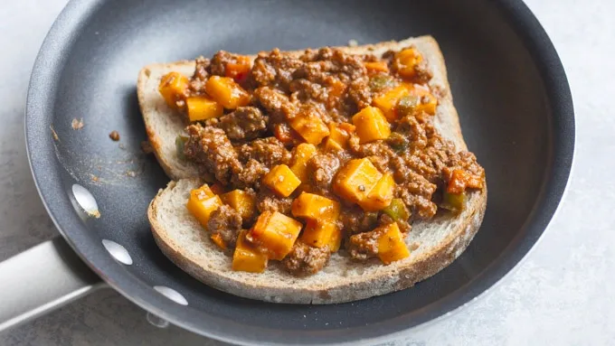 Add one slice of bread, buttered side down, to the hot skillet. Top with the cheese and sloppy Joe mixture. Add the second piece of bread, buttered side up. Cook over low heat for 3-4 minutes per side until bread is nicely browned and cheese is melted.
