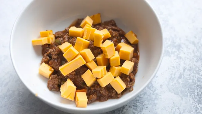 Cut cheddar cheese into 1/4-inch cubes. Take about 1/2 cup of the sloppy Joe mixture and stir in 1-2 oz cheddar cheese cubes, depending on how cheesy you’d like your sandwich to be.