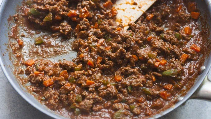 Add green peppers and carrots to the beef mixture and cook for another few minutes until veggies start to soften. Then add garlic powder, tomato sauce, Worcestershire sauce, brown sugar, and a pinch of salt and pepper. Stir together and simmer for about 5 minutes so mixture can thicken. If the sloppy Joe mixture seems dry, add 1/4 cup water.