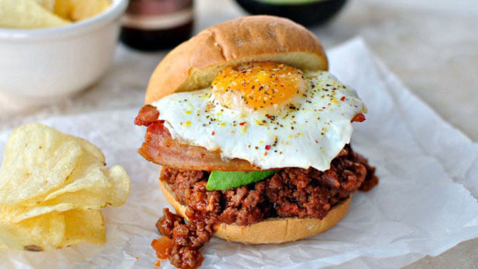 Step6Build the sandwich by scooping out about a 1/2 cup of sloppy joe filling and place it onto the toasted bun. Top with a slice of bacon that has been cut in half, a few slices of avocado and a fried egg.