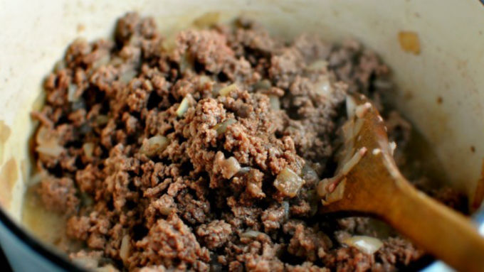 Step3Add in the ground beef, use a wooden spoon to break up the meat and cook for another 5-8 minutes or until browned and fully cooked.