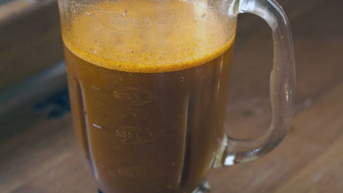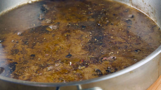 Step7Remove bay leaves from cooking liquid and pour into a blender. Blend until smooth.