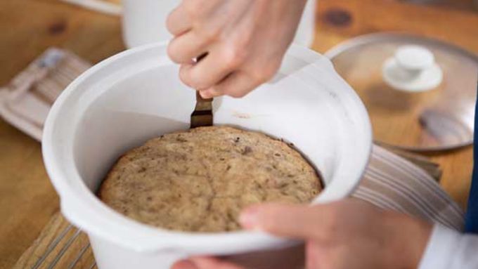 Step4Cover; cook on High heat setting 1 hour 30 minutes to 2 hours or until toothpick inserted in center of loaf comes out clean. Turn off slow-cooker; uncover, and remove ceramic base from cooker to cooling rack. Let cool 15 minutes.
