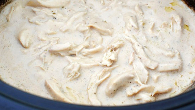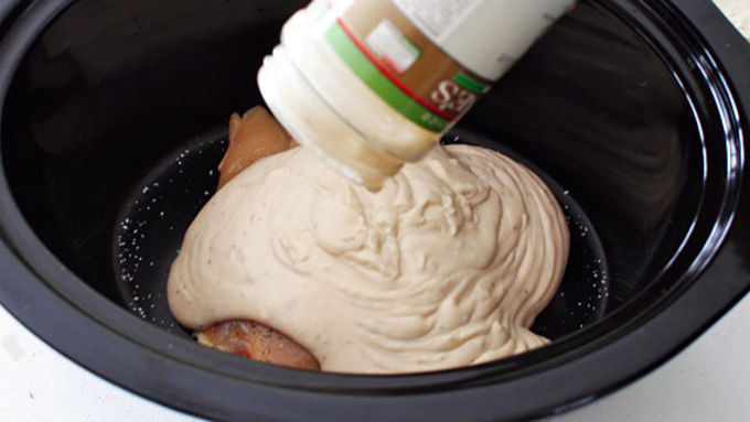 Step1Place the chicken breasts in a slow cooker and season with salt and pepper. Pour the Alfredo sauce over the chicken and cook for 3 hours.