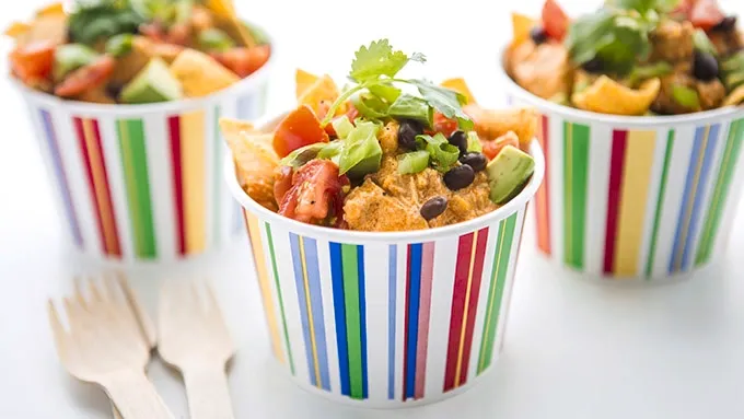 - It’s like customizable enchiladas for a crowd. Quick, simple and so good. Fire up that slow cooker and prep a party-perfect dish. With this easy little recipe, you’ll create a crock full of creamy chicken enchilada sauce, which is served over corn chips and topped with all your favorite fixin’s. Round up your chicken breasts, cream cheese, chicken broth, cheddar and Old El Paso™ taco seasoning. (Alternately, you can nix the broth and taco seasoning and just toss in 2 cans of enchilada sauce. Whatever you’ve got in the pantry works!) Place it all in your slow cooker and cook for 4-5 hours on low or 6-7 hours on high. Just before serving, use a fork to shred the chicken and stir it into the slow-cooker sauce. Spoon this mixture over corn chips and top with avocado, diced tomato, black beans, cilantro and scallions. We used disposable bowls, but you can also hit a party store and layer the mixture in a paper dish—you know the ones they serve hot dogs in? Yum. Is this not the most fantastic meal idea? Can’t you just see all your favorite friends devouring it at your next shindig?