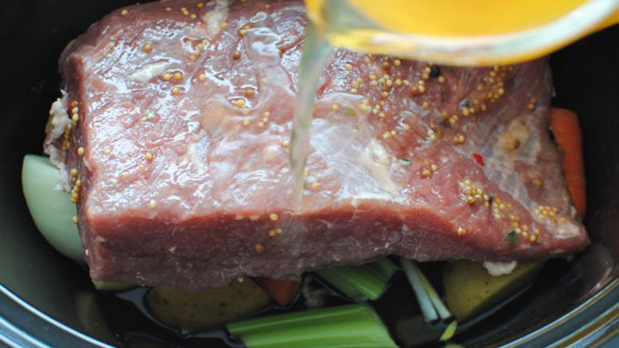 Step3Discard vegetable solids from the slow cooker, but keep about a cup of the broth. Serve corned beef with any sides you prefer. Lightly pour the broth over the beef.