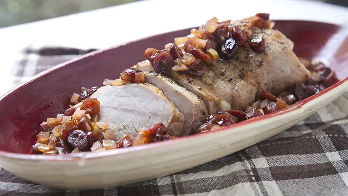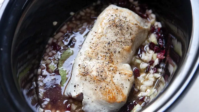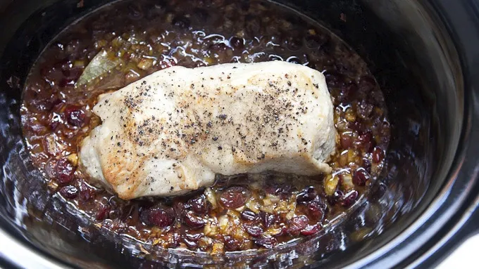 - Pork tenderloin gets a holiday makeover with cranberries, but its easy prep and cooking in the slow cooker can be your secret! Pretty enough for guests but easy enough for a weeknight – that's this cranberry pork roast. There's a huge amount of recipes during the holidays that require a lot of effort, so it’s helpful to have some hands-off recipes at the ready that you can whip up and serve to impress, but aren’t actually that much work. The slow-cooker is a great tool for these kinds of meals! This delicious, savory and juicy pork roast is slow cooked in a slightly sweet cranberry sauce that really brings out the flavors of the holidays. It doesn’t have a ton of ingredients, yet the flavors are really complex and wonderful. The basic ingredients for the slow-cooker are an onion, some dried cranberries, and some jam. Grape or blackberry work really well. While you could just throw the pork in there at this point, searing the pork first makes the final dish better. This isn’t too hard. Just season it with salt and pepper and sear it for a few minutes per side in a cast iron skillet (or any sturdy skillet). Then adding about a cup of water to the skillet you seared the pork in to scrape up any bits left in the pan, you can pour that liquid in the slow cooker as well. Lots of flavor there! Then let the slow-cooker do its magic! When it's done, just slice the pork and ladle the sauce over the top! All in all, it’s a meal that really seems elegant for the effort it takes. Serve it to your friends and family, but feel free to keep the cooking trick a secret. It’s safe with me!
