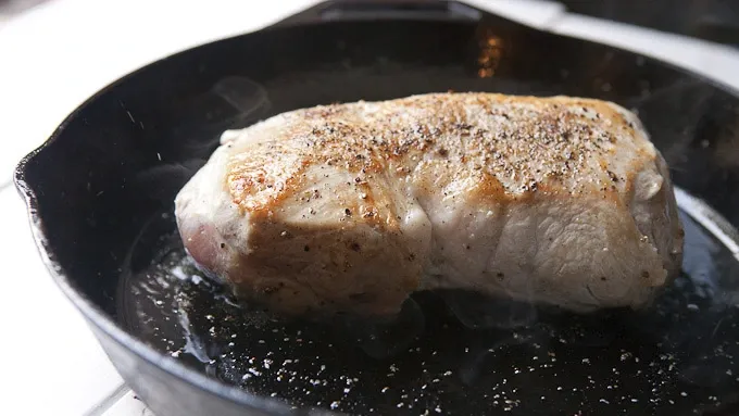 Step1Season pork roast with salt and pepper on all sides. Heat a large cast iron skillet or sturdy pan over medium-high heat.