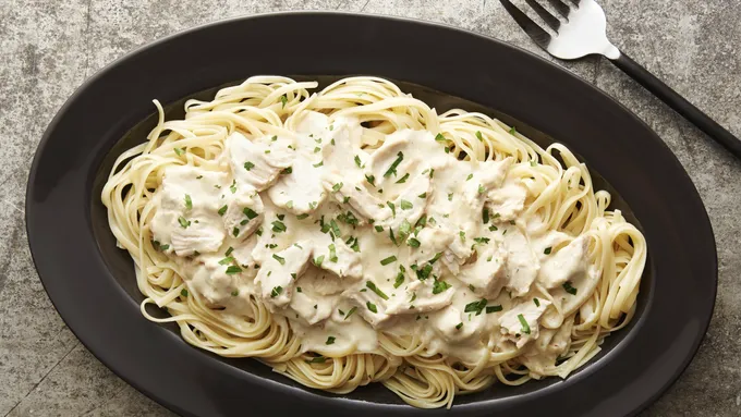 - It's the simple things like this slow-cooker cream cheese chicken that make life worth living. We won't blame you for wanting to pour the easy-to-make rich, creamy cheese sauce included in this recipe all over everything. Pasta? Yes. Mashed potatoes? Absolutely. When choosing which noodles should go in this dish, we suggest going with egg noodles or some other corkscrew-shaped noodle. Why? The grooves in these spiral-shaped noodles are the perfect traps for silky cheese sauce, ensuring maximum cheese quantity in every bite. White rice is also an excellent choice for a hearty pairing. This is one of our favorite chicken recipes, but since you can never have enough chicken dishes, we have tons of recipes just for you.