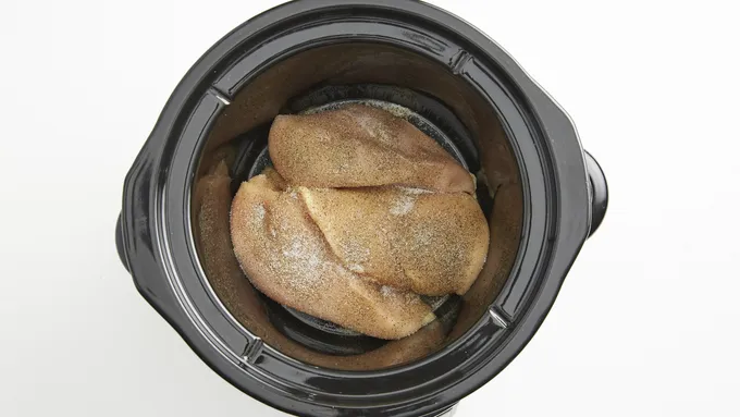 Step1Sprinkle chicken with salt and pepper and place in bottom of slow cooker.