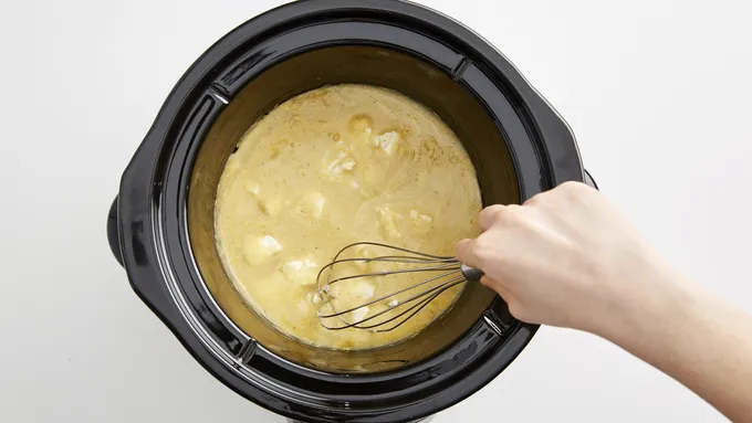 Step3Fifteen minutes before end of cook time, remove chicken from the slow cooker. Break softened cream cheese into chunks and add to slow cooker, whisking until the sauce is smooth.