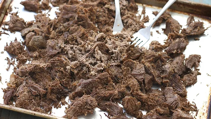 Step3Transfer roast from slow cooker to a rimmed baking sheet; reserve sauce. Use two forks to pull apart meat into shreds. Place baking sheet under broiler for 3-4 minutes until edges of meat are crispy.