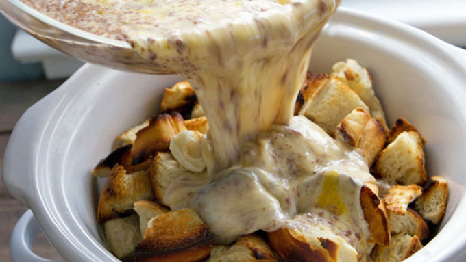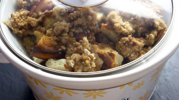 Step2Spray a 4-5 quart slow cooker with non-stick baking spray. Place the dried bread pieces into your prepared slow cooker.