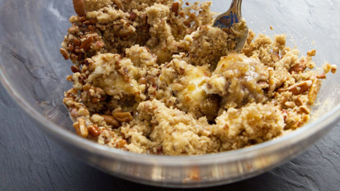 Step5In a small bowl, use a fork to combine the brown sugar, butter, and nuts. Sprinkle mixture over the top of the bread.